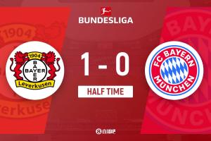 上半场伤停补时4分钟,半场结束,拜仁暂0-1勒沃库森。