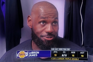 比赛最后时刻詹姆斯发球给东契奇后者被犯规,第一罚投丢后命中第二个得分达到60,谈到这个瞬间,詹姆斯说:“你们都看到了我们在场上的反应。我们都非常高兴他能罚进最后一个球,让他拿到60分。”